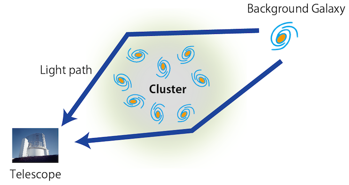 Galaxy clusters are the largest celestial body in the Universe (Fig.1). However, it has been difficult to measure their size and mass accurately because they mainly consist of dark matter that we cannot observe directly. One way to observe the dark matter indirectly is to use the gravitational lensing effect based on Einstein's theory of relativity. Light rays from a galaxy behind a cluster are pulled by the gravity of the cluster as they pass through it, and their paths are bent (Fig.2). This is exactly the same effect as a lens, focusing the light of the distant galaxy and distorting its shape. If we can measure the distortion of the shape for many background galaxies, we can reveal the gravitational field of the cluster, and as a result, we can accurately measure its size and mass.