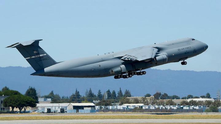 The California heat is stifling as we climb the 14-foot ladder into the passenger compartment of the C-5 Galaxy, the largest plane flown by the US Air Force. I had been told to expect a cold flight, and wore four layers of clothing. Now, sweat drips down my face. Everyone wears ear protection to drown out the engulfing noise of the four van-size jet engines hanging from the wings. A passing airman’s backpack bears a patch with the slogan “Embrace the Suck.” Good advice.