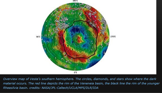 Most of the dark, carbonaceous material on Vesta can be found on the rims of smaller craters ... credits: NASA/JPL-Caltech/UCLA/MPS/DLR/IDA