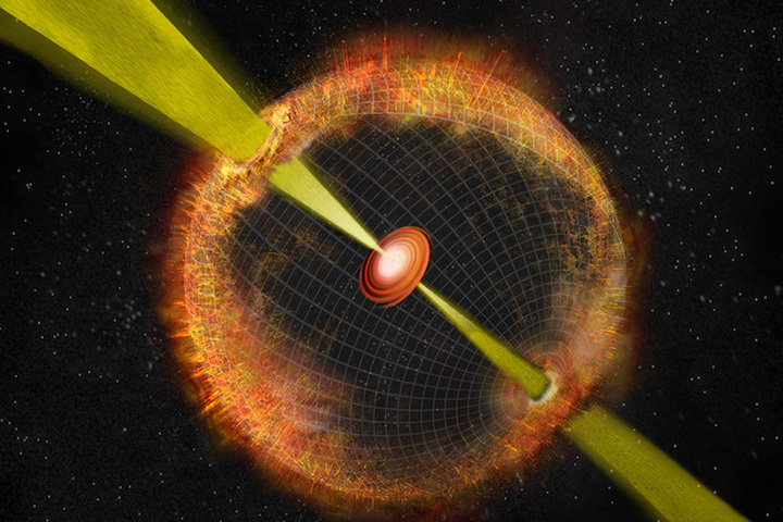 Based on the extreme brightness of the radio source and the type of galaxy in which the flare-up occurred, Law argues that it was the afterglow of the explosion of a massive star, which would have emitted an undetected long-duration gamma-ray burst. Gamma-ray bursts, whose origins are still contentious, are among the most intense flashes in the universe because much of their explosive energy is collimated into a tight beam, like that from a lighthouse.