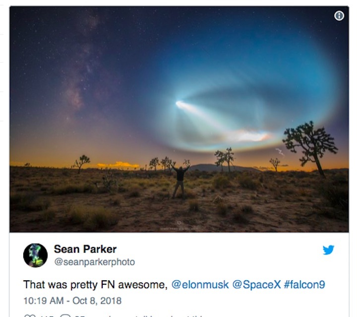 "That was pretty FN awesome, @elonmusk @SpaceX #falcon9," Parker tweeted yesterday (Oct. 8), along with a photo of himself exulting in the desert beneath the glowing cloud.