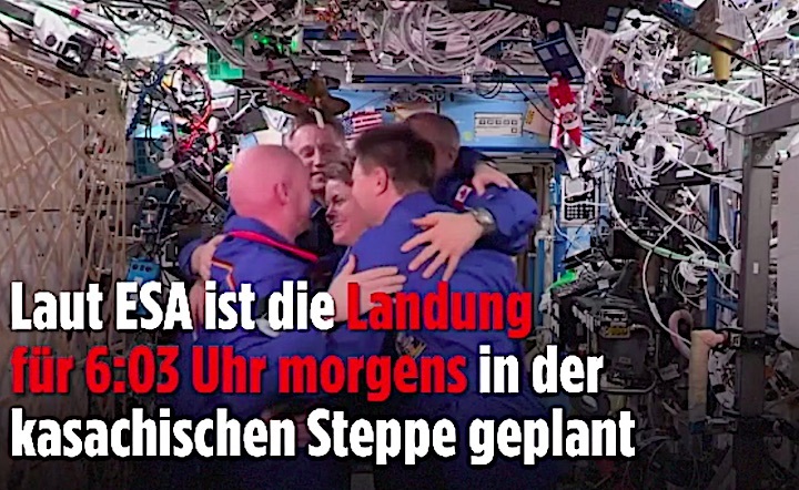 Gerst sollte noch am Donnerstag zurück nach Deutschland fliegen. Um 20.45 Uhr wird er am Flughafen Köln/Bonn erwartet. Danach soll es für ihn zu einer medizinischen Forschungsanlage des Deutschen Zentrums für Luft- und Raumfahrt (DLR) in Köln gehen. Seine Heimatstadt Künzelsau plant für nächsten Sommer eine große Feier zu Ehren Gersts.
