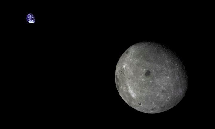 The far side of the Moon and the distant Earth, imaged by the Chang'e-5T1 mission in 2014. Chinese Academy of Sciences