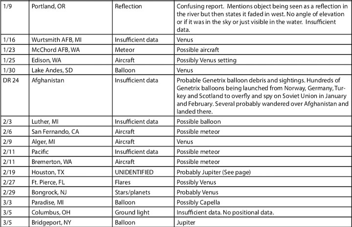 The 20% incorrect evaluation value was higher than the 16-17% from 1955. Looking at these cases, I believe that at least one, and maybe two, cases involved a sighting of the moon. Additional information may have resolved the second case. As it is, I can only assume the witness was looking in the right direction. I noticed that Venus seemed to be a significant source of UFO reports during this time period. Roughly 15% of the cases involved the planet Venus. Missing from all of these sighting files is any participation from Dr. Hynek. If he was involved, he did not seem to make his presence felt. It is important to continue to point out that the lack of adequate information in these case files continue to make it difficult to identify the source. Lack of information is probably the primary reason Blue Book had problems doing their job properly.