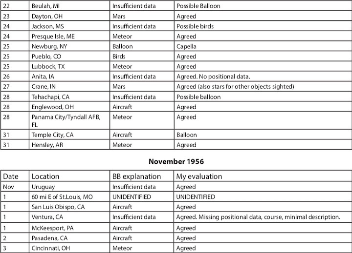 The 17% incorrect evaluation value was less than the 20% from the first half of 1956. Lack of information continues to be a big mid-September and it was as bright as magnitude -2.5 between mid-August and late September. Because of this, Blue Book tended to identify anything that was red, and in the evening sky, as Mars. In most cases, they were correct. However, a few of them were not (see the reclassification table). They also missed a few that were probably Mars. It depended on the local investigating officer. There were two cases of the moon being the probable source of the report. There were also four possible cases of Venus being seen in daylight. Finally, in early November, two reports were identified as missile sightings. This was due to a message stating that the USS Rushmore was in the North Atlantic firing missiles. However, these sightings were probably meteors instead. There are no re- cords of missiles being fired on the dates in question. Missing in all of these astronomical explanations was Dr. Hynek, the programs scientific consultant. Either he was too busy to write/comment or Blue Book did not send him any reports.