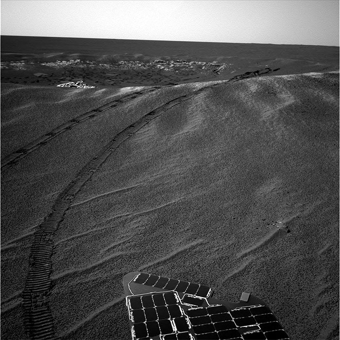 Left Navigation Camera Non-linearized Full frame EDR acquired on Sol 51 of Opportunity's mission to Meridiani Planum at approximately 15:54:27 Mars local solar time. NASA/JPL