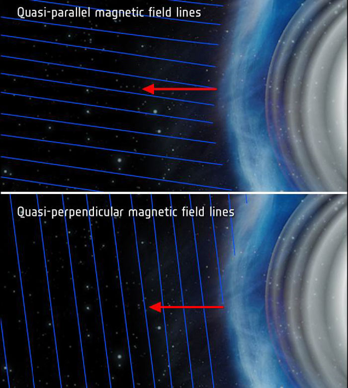 Under quasi-parallel conditions, the planet's magnetic field is roughly pointing toward the shock surface, almost parallel to a vector at right angles to the shock front (red arrow). Under quasi-perpendicular conditions, the magnetic field is close to aligned with the shock surface, that is, almost perpendicular to the shock vector.