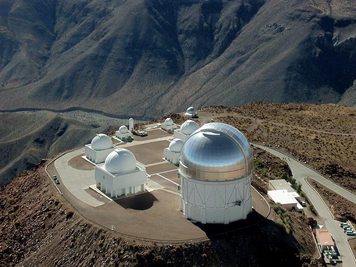 An aerial image of the Cerro Tololo Interamerican Observatory in Chile, with the silvery dome of the 4-meter Blanco telescope pictured at lower right. (Credit: NOAO/AURA/NSF)