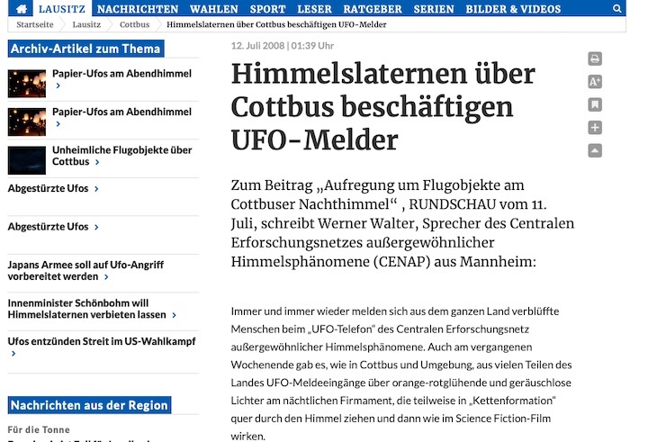 Unter der Schlagzeile ´Himmelslaternen über Cottbus beschäftigen UFO-Melder´ ( http://www.lr-online.de/regionen/co... ) hieß es in einem zweiten Artikel weiter:
