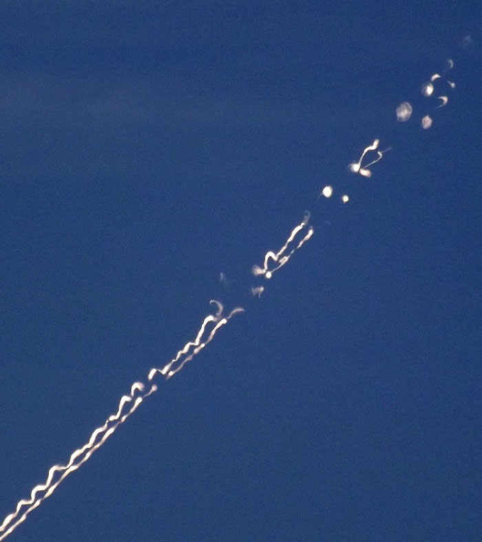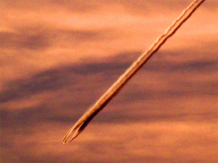 Am Ende des Kondensstreifen sind bereits Auflösungen zu erkennen, welche durch Windverwirblungen verursacht werden...