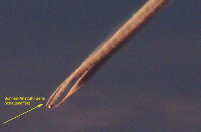 Inzwischen erreicht der A-380 die Position zur untergegangenen Sonne, bei welcher der Kondensstreifen einen Schatteneffekt bekommt