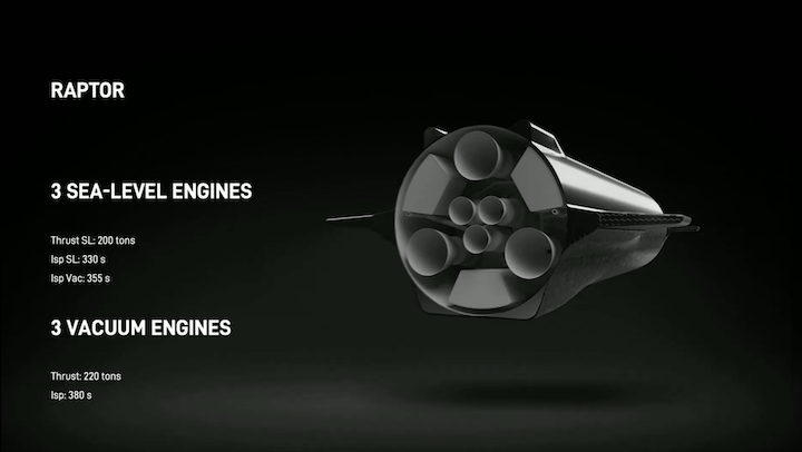 Starship will feature three sea-level engines and three vacuum optimized engines. According to Musk, the sea-level engines will feature a high range of gimbal. Meanwhile, the vacuum optimized engines will have their nozzles fixed to the base of the Starship vehicle for stability.