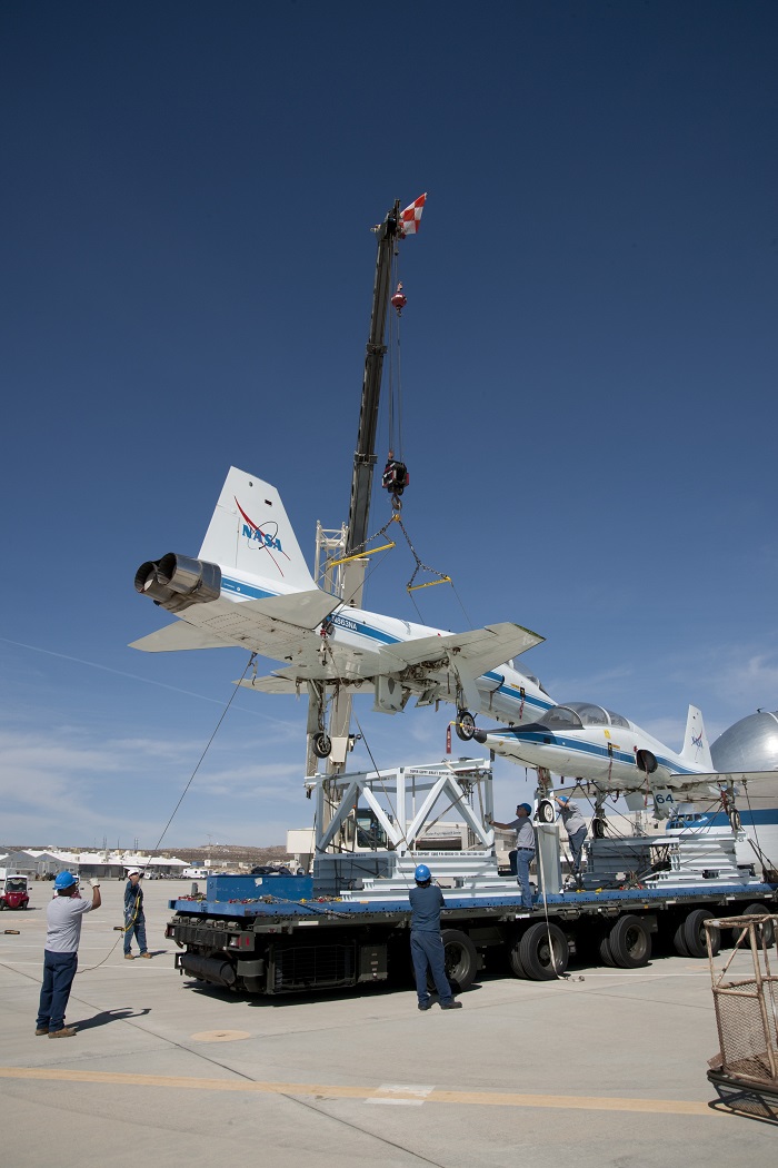 Two retired NASA T-38 trainers mounted on a transport pallet atop a mobile transporter are positioned for loading aboard NASA's Super Guppy prior to ferrying them to El Paso, Texas, for disassembly.