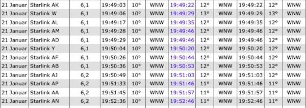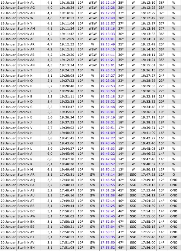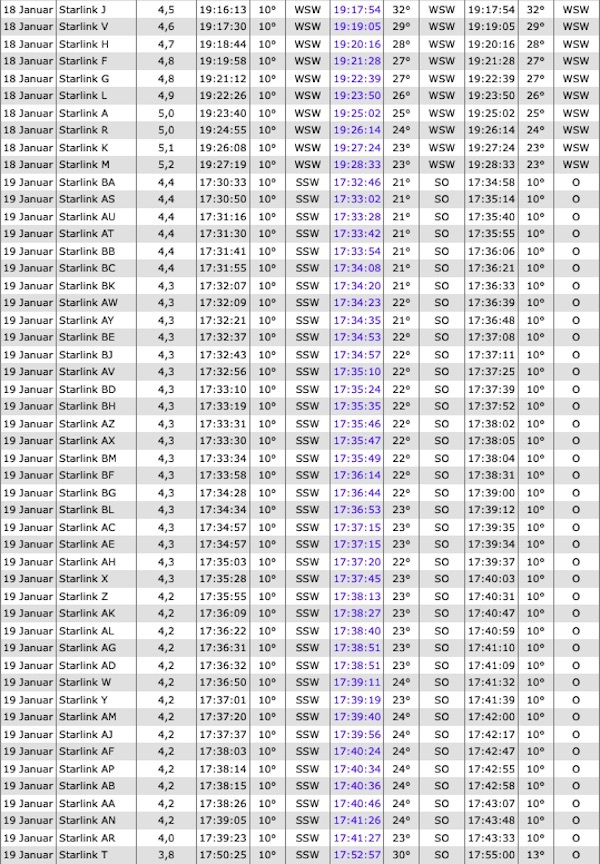 Überflug-Zeiten Starlink Satelliten 17-21 Januar 2020