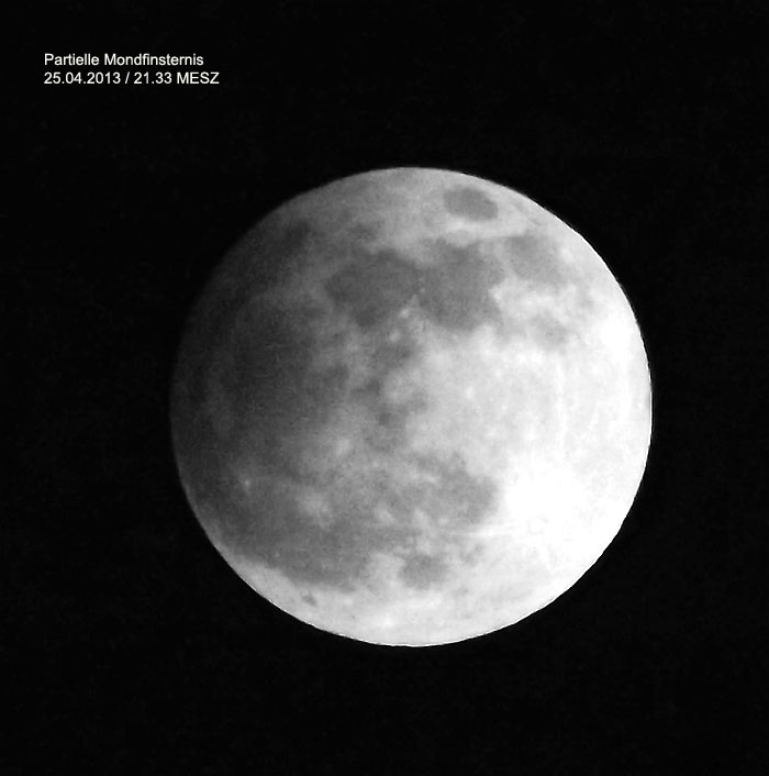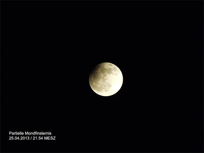 Finsternisfans müssen sich den Abend des 25. April 2013 in der Agenda anstreichen. Es ist keine spektakuläre Mondfinsternis, die ab 21:52 Uhr MESZ für kurze 32 Minuten partiell wird, aber dennoch interessant, da die Erdschattenvergrösserung, bedingt durch die Erdatmosphäre, zur Partialität beiträgt.Die Finsternis beginnt mit dem Eintritt des Mondes in den Halbschatten der Erde unbemerkt bereits um 20:02 Uhr MESZ - der Mond ist dann verbreitet noch unter Horizont und geht erst während der Halbschattenfinsternis auf. Erst mit der Zeit wird auch der flüchtige Betrachter feststellen, wie sich die Mondscheibe im oberen linken Sektor in Bezug auf den Horizont allmählich einzutrüben beginnt.