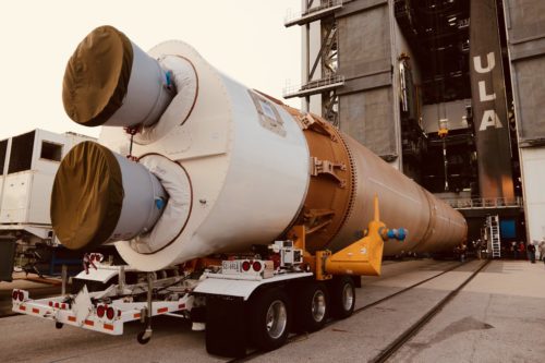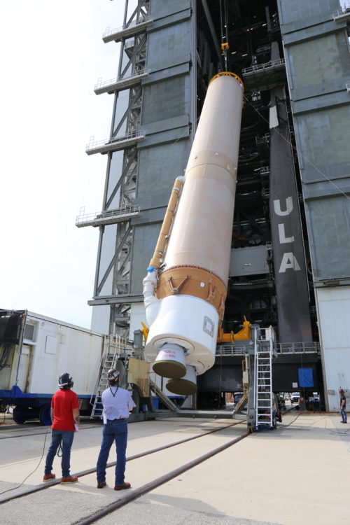 Just before dawn on 23 April, ULA began its Launch Vehicle On Stand (LVOS) milestone, which saw the Atlas V CCB transferred horizontally atop a semi-truck from the ASOC to the door of the VIF. It was hoisted upright by overhead cranes and secured onto the Mobile Launch Platform (MLP) by means of three support pedestals. Two days later, the Off-Site Vertical Integration (OVI) pre-assembled unit—which comprises the Centaur upper stage, the rocket’s inter-stage adapter and the lower half of the payload fairing—arrived at the VIF and were installed atop the CCB in a process which concluded Monday, 27 April.