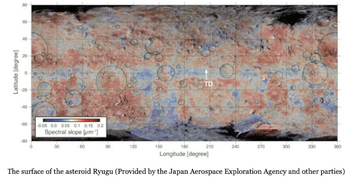 This diagram provided by a research team led by University of Tokyo associate professor Tomokatsu Morota shows the spectrum of colors on the surface of the asteroid Ryugu, which can be observed due to differences in the way sunlight reflects off each part. The reddish areas are believed to have been exposed to extreme solar heat. "TD" marks the area where space probe Hayabusa2 made its first landing. The color of the surface cannot be distinguished and appears all dark to the human eye.