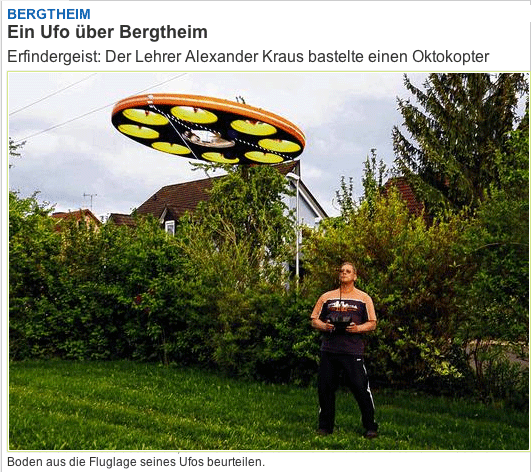 Einen Kindheitstraum hat sich Alexander Kraus aus Bergtheim erfüllt. Der 59-jährige Physik-, Mathematik und Religionslehrer an der Jakob-Stoll-Realschule in Würzburg hat ein Ufo gebaut. Der „Oktokopter“ hat 1,20 Meter Durchmesser, ist aus bemaltem Bau-Styropor und wird von acht Propellern elektrisch in die Luft gehoben. Der Jungfernflug hat jedenfalls geklappt