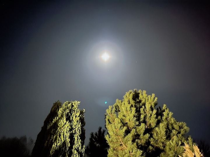 Noch irritierender sieht die Aufnahme beim Vergrößern des Ausschnittes aus, da man den Eindruck hat das "Leuchtobjekt" hinter den Ästen schweben zu sehen. Man könnte es nun als "UAP" einstufen, aber es ist nur eine Linsenreflexion der Handy-Kamera, was bei einer weiteren Aufnahme am Folgetag bei gleichen Bedingungen ebenfalls erzielt werden konnte.