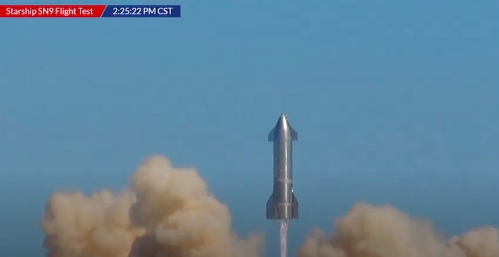 At 2:25 p.m. Central time, the 165-foot Starship known as Serial Number 9, or SN9, blasted off from Boca Chica – located near the Texas–Mexico border – on a brief test flight. It automatically throttled down its Raptor engines at about 33,000 feet, then performed a "belly flop" maneuver using adjustable fins to establish a trajectory back toward the launch site.