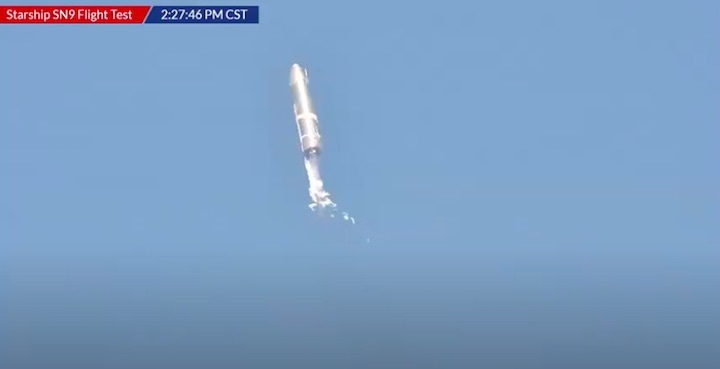 Though the test achieved SpaceX's primary objective, SN9 failed to fully flip from "belly-down" to an upright position, causing it to explode on impact.