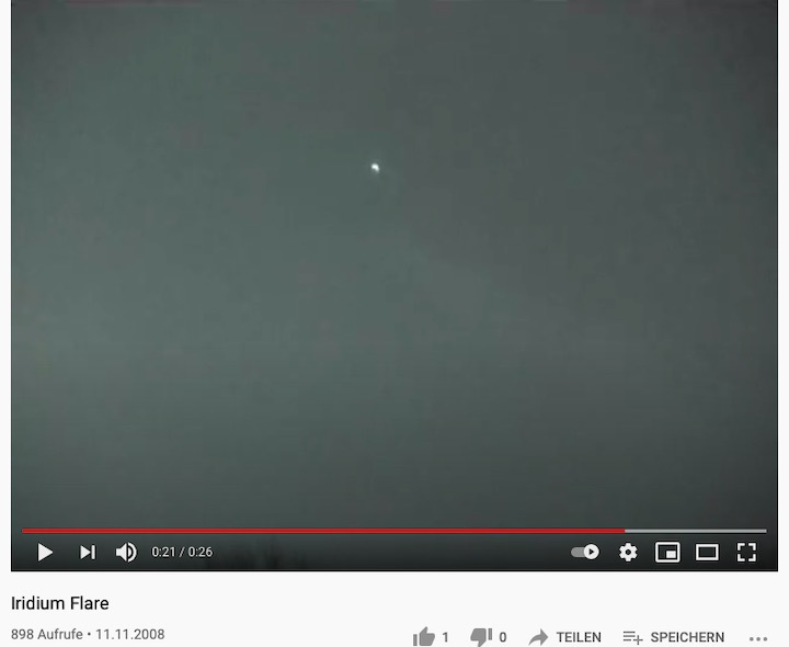 Donnerstag, der 7.Mai 2009 - aber erst einmal zurück zur vergangenen Nacht, aber sicherlich anders wie Sie erfahrungsgemäß es erwarten, wenn dieser Satz fällt. Um 23:42 h stand ich auf meinem Balkon bereit, um den ´Iridium 82´-Flare mit -6.0mag in WSW zu beobachten. Sah wirklich tol/grell trotz dem Vollmondlicht aus dem Süden aus, Sie wissen ja als fleissiger Newsticker-Leser und nicht unbedingt als ´Mystery-Shoper´ - der ja wissen will, was in der UFO-Welt wirklich jenseits der UFO-Dreamworld geschieht und mit rationaler Betrachtung vor sich geht - natürlich, dass sie diese Flares unter http://www.astronomie.info/calsky/S... für sich an Ihrem Wohnort berechnen lassen können. Ab und an mache ich dies auch für Mannheim und heute war das Wetter gut und der Flare mit -6.0mag wirklich fett - so in etwa wie hier auf Video: