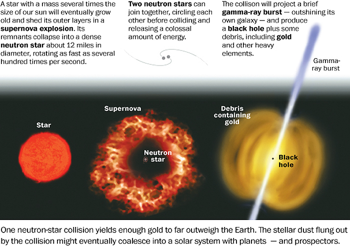 All the gold in the cosmos may have come from stellar cataclysms -- the collision of two neutron stars, which sends bursts of particles and radiation into the universe.
