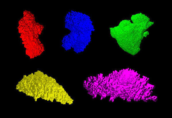 Colorized screenshots of the exact shapes of moon dust collected during the Apollo 11 mission. NIST researchers and collaborators developed a method of measuring these nanoscale particles as a prelude to studying their light-scattering properties.