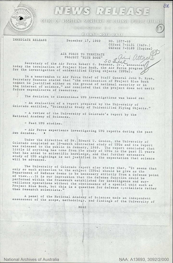 The declassified report is located on the National Archives of Australia website and features 58 pages of compelling information on UFO sightings and strange encounters with alien creatures between 1957 and 1971. Page 32 of the report states, "50m from object, witness paralyzed (also birds and cows). Four handsome men with brown skin emerge with translucent helmets." The report also shows the United States has been involved in UFOs and conducting investigations into them since 1947.