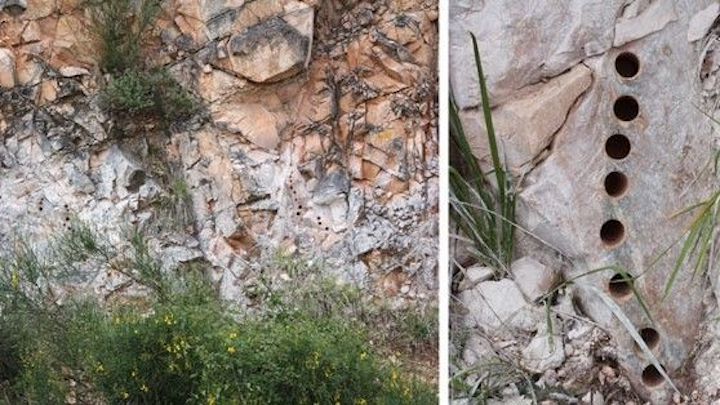 The limestone deposits in Italy which contain the fossilized magnetite (left) and the drill holes leftover from where researchers extracted some of their samples (right). (Image credit: Ross Mitchell/Tokyo Institute of Technology