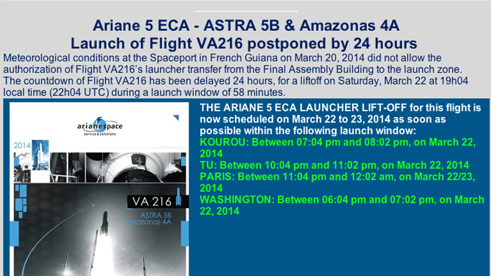 Arianespace Flight VA216: Ariane 5 ECA – ASTRA 5B – Amazonas 4A; Liftoff is set for Friday, March 21, 2014