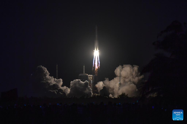 A Long March-7A rocket carrying two satellites blasts off from the Wenchang Spacecraft Launch Site in south China's Hainan Province, Dec. 23, 2021. The rocket blasted off at 6:12 p.m. (Beijing Time) at the Wenchang Spacecraft Launch Site in southern Hainan Province and soon sent Shiyan-12 01 and Shiyan-12 02 satellites into preset orbit.