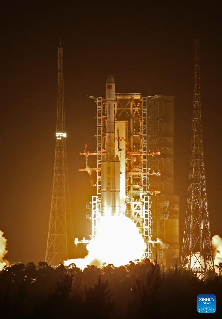 The Long March 7A lifted off from the coastal Wenchang Satellite Launch Center at 5:12 a.m. Eastern, rising into a broken cloudy sky just after local sunset.