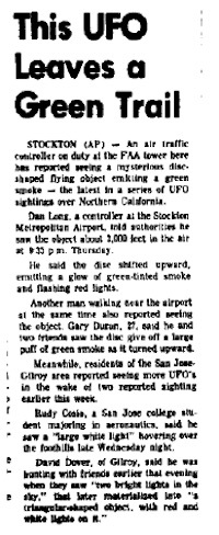 9:35 p.m. Dan Long, a controller at Stockton Metropolitan Airport, sighted a UFO. He stated that the disc-shaped object was at an altitude of about 2000 feet. The disc then moved upward while emitting a glow of green tinted smoke and flashing lights red lights. Mr. Gary Duran and two friends also the same object while walking near the airport. UFOs have been sighted for a two week period throughout Stockton, San Jose-Gilroy area by numerous witnesses. (Reference: UFO INVESTIGATOR, October 1975, page 3; NICAP UFO Evidence II, Sections III, IX).2