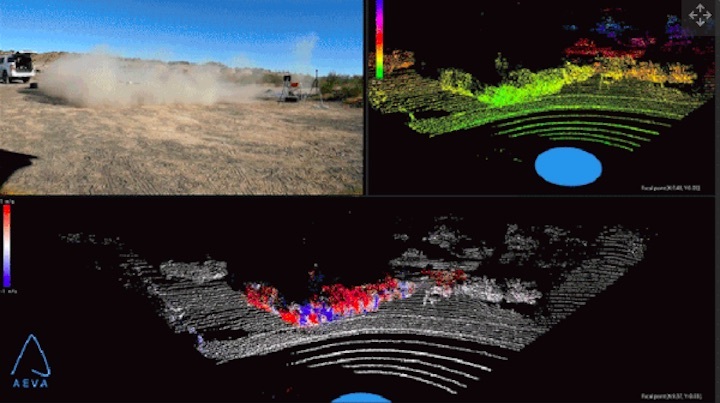 KNacK can combine high-definition video (upper left) with lidar ranging data (upper right), along with lidar Doppler velocity data. These all give different data streams showing a UAV drone landing in the New Mexico desert. (Image credit: NASA/Michael Zanetti)