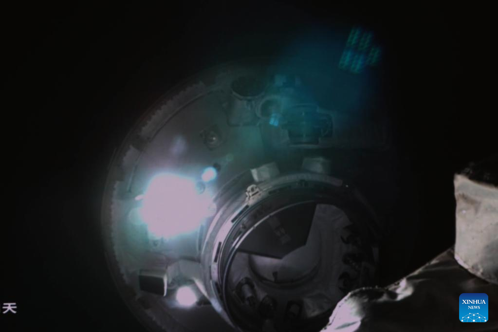 Under the coordination between space and Earth, and coordination with astronaut Cai Xuzhe inside the lab module, the pair completed a series of tasks, including the installation of the extended pump set of the Wentian lab module, lifting the lab module's panoramic camera, and the verification of capability for independent transfer and emergency return to the spacecraft. (Photo by Li Jie/Xinhua)