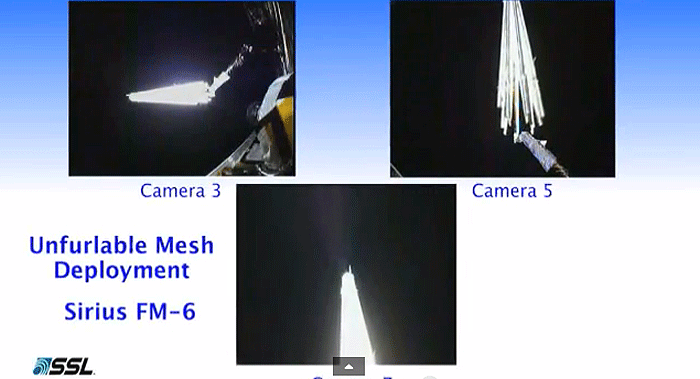 Pasadena, CA – March 3, 2014. A multi-camera onboard video system supplied by Ecliptic Enterprises Corporation has successfully captured the 7-hour deployment sequence for the large main antenna on the Sirius FM-6 spacecraft.