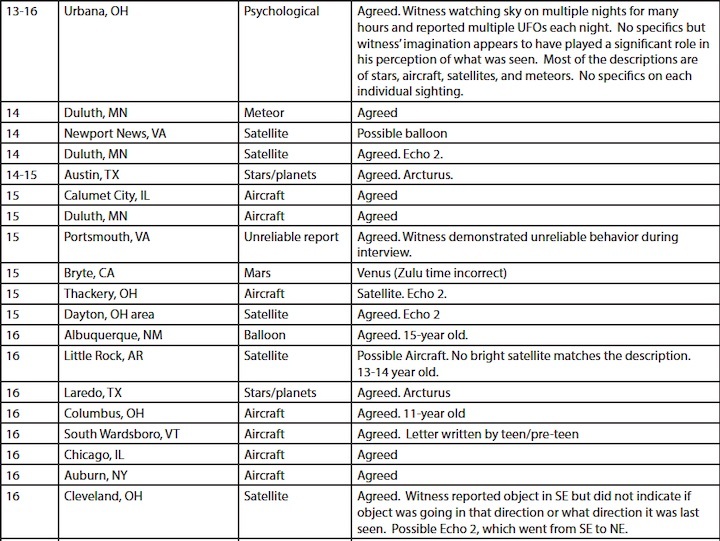 As I expected, this time period was going to be challenging to evaluate. There were many sightings over a brief period of time, which swamped the Blue Book staff. Many have probable explanations and it is hard to say exactly why there was a sudden flurry of UFO reports. I suspect it had a lot to do with the beginnings of the Gemini space program and other space activities. Adding that to the normal summer peak of UFO sightings, could explain the massive influx of reports.