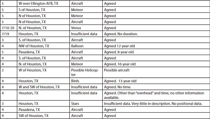 Last issue I complained about how Blue Book was taking multiple sightings and placing them in a single case file. Little did I realize that local UFO officers were making this a bad habit. Pittsburgh submitted multiple reports, which involved nothing more than a typed summary with dates and brief descriptions of each sighting. There were some report forms but the rest had very little information about the sighting. The area around Houston, Texas had two case files with a total of 104 individual sightings! A good percentage of those were missing. To their credit, they did use some type of local reporting form. Some of these did have most of the pertinent information for analysis. Others had missing information.