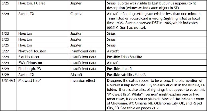 This is the latest edition of the Project Blue Book case review covering July and August 1965. Like the previous evaluations, I tried to examine each case to see if the conclusion had merit. I added comments to help clarify the explanation or if I felt it was not correct or adequate. There are three sightings that are marked with an asterisk. They contain multiple sightings which are examined in separate tables.