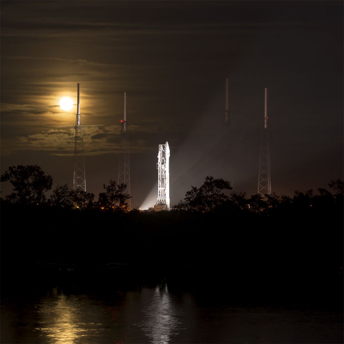 A full moon rises behind the United Launch Alliance Atlas V rocket with NASA's Mars Atmosphere and Volatile EvolutioN (MAVEN) spacecraft onboard at the Cape Canaveral Air Force Station Space Launch Complex 41, Cape Canaveral, Fla. on Nov. 17, 2013.