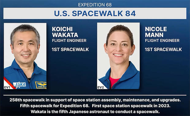 Japanese astronaut Koichi Wakata and NASA astronaut Nicole Mann suited up and floated outside the International Space Station Friday for a spacewalk to prepare the lab for arrival of another pair of new solar arrays later this year.