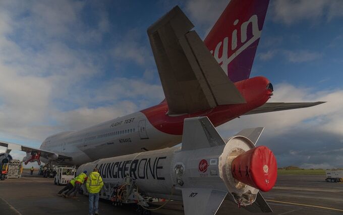 Virgin Orbit's LauncherOne rocket attached to a specially adapted 747 aircraft