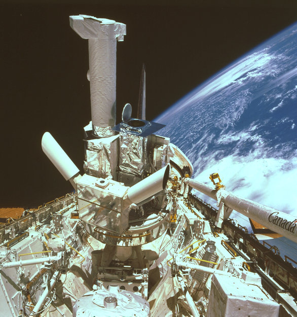 An inspiring view of the Spacelab D-1 module in the Shuttle Challenger's open payload bay, viewed through the flight-deck rear windows. The Shuttle manipulator arm is on the right, and the disc of Earth in the background. The Spacelab D1 mission flew in space between 30 October and 6 November 1985.