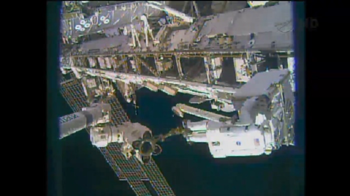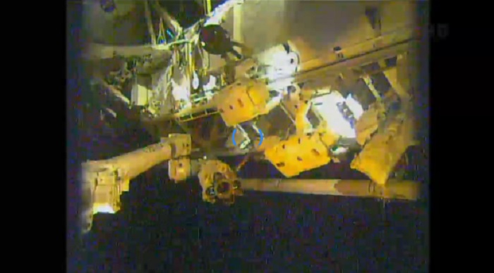 That took care of all the originally assigned duties. Then, with Mission Control's go-ahead, they pulled out the pump module and hooked it onto a storage fixture. Japanese astronaut Koichi Wakata helped out from inside the station by operating the 58-foot-long (18-meter-long) robotic arm.