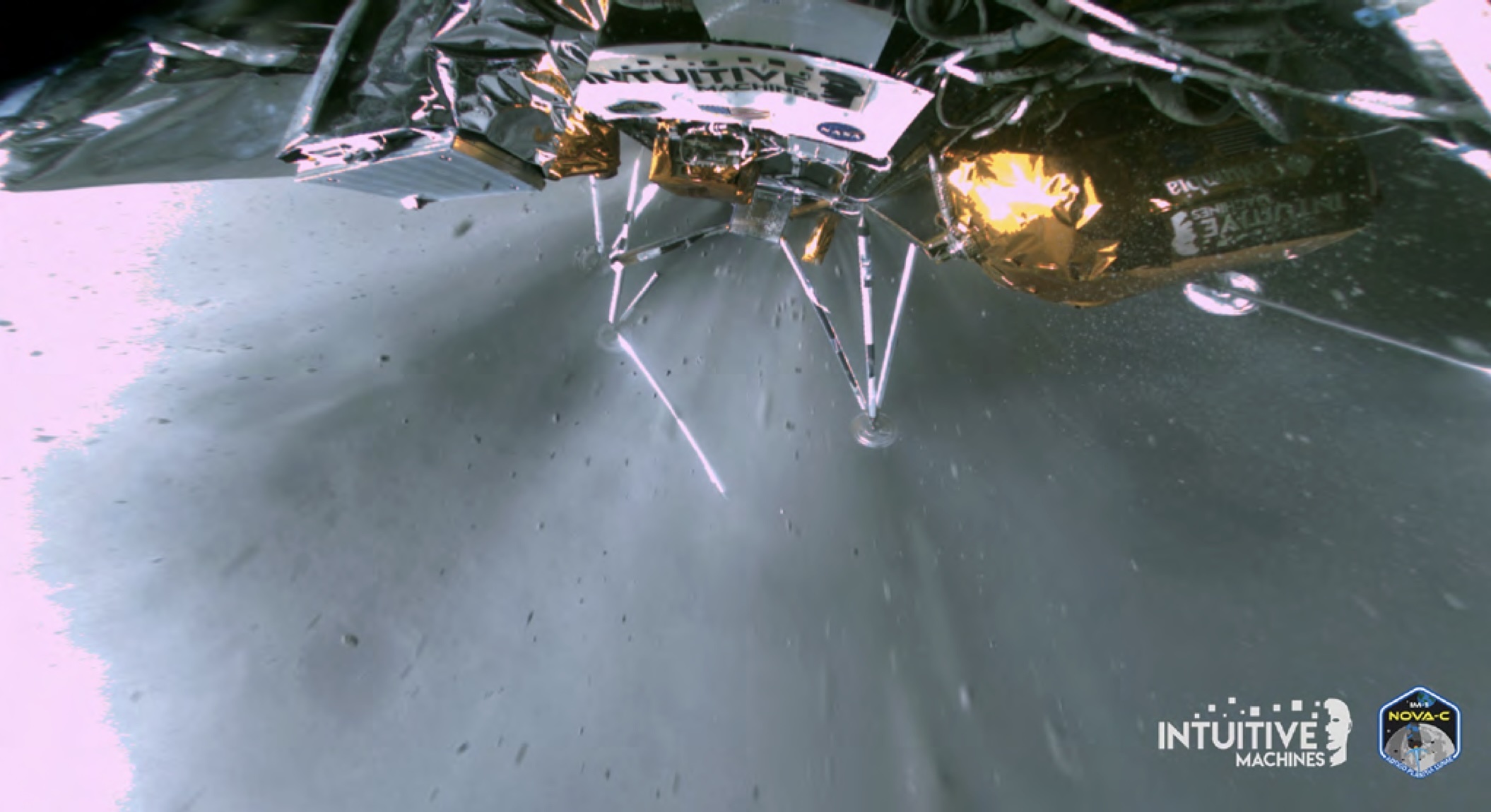 Odysseus captured this image approximately 35 seconds after pitching over during its approach to the landing site. The camera is on the starboard aft-side of the lander in this