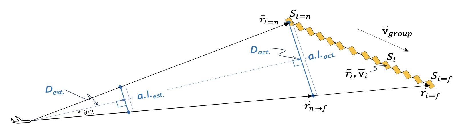 Figure 16. This is a vector diagram representation of the location of the 𝒊𝒕𝒉 Starlink satellite in the train with 𝒊 = 𝒏 for the nearest visible satellite in the train, and 𝒊 = 𝒇 for the furthest visible satellite in the train, as viewed from the cockpit. The diagram is drawn in relation to the common method for calculating the size of a rigid object at an estimated distance Dest. and is represented by the solid blue arrow ending at the estimated apparent length a.l.est. which is also in blue font. Dest. is perpendicular to a.l.est.. The apparent actual distance, Dact. is represented by the continued dashed blue arrow that starts at the aircraft and ends at the actual apparent length a.l.act. which is also in blue font. Dact. is perpendicular to a.l.act.. Hence, the actual apparent length starts at the distance from the aircraft to the nearest satellite with state vector 𝐫⃑𝒊$𝒏, 𝐯)⃑𝒊$𝒏 relative to the aircraft and is represented as 𝑺𝒊$𝒏 in the diagram. The actual apparent length terminates along the line of sight (LOS) to the last visible satellite in the group with the position vector is 𝐫⃑𝒊$𝒇, so that the actual apparent length is perpendicular to the actual apparent distance and is the projection of the nearest visible satellite's position vector onto the furthest visible satellite’s position vector 𝐫⃑𝒏→𝒇. The apparent velocity of the group (𝐯)⃑𝒈𝒓𝒐𝒖𝒑) would be moving from the upper left to the lower