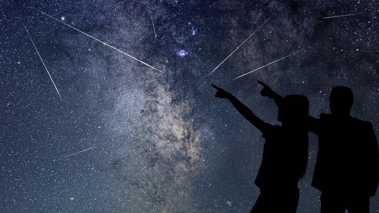 What appears to be stars falling from the black curtain of space are fragments of comet and asteroid rubble burning up in the Earth’s atmosphere as our planet spins through their path.