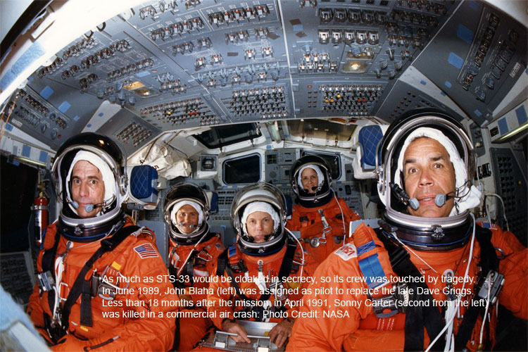 Thornton secured a minor record of her own on STS-33, becoming the first and only woman to fly aboard a classified Shuttle mission. Many have speculated that her assignment came about because she had served as a research physicist at the Army’s Foreign Science and Technology Center, before becoming an astronaut, and had worked on a NATO-awarded post-doctoral fellowship at the Max Planck Institute for Nuclear Physics in Heidelberg, West Germany.