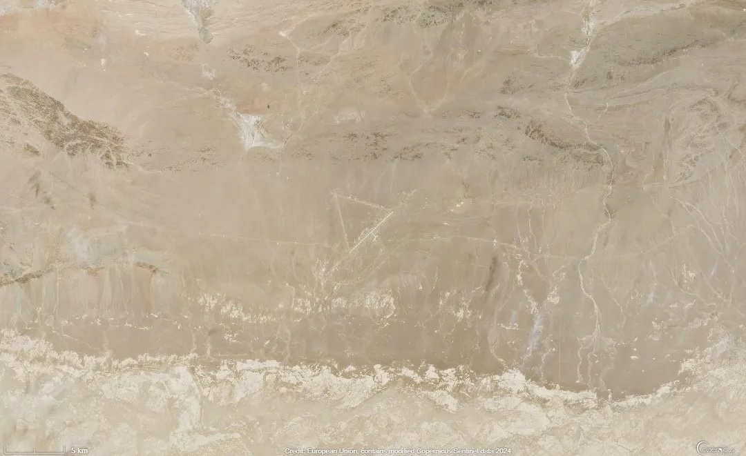 Sentinel 2 L2A satellite imagery showing the triangle area at Lop Nur where China's reusable spaceplane is thought to land. Credit: European Union/modified Copernicus Sentinel data 2024